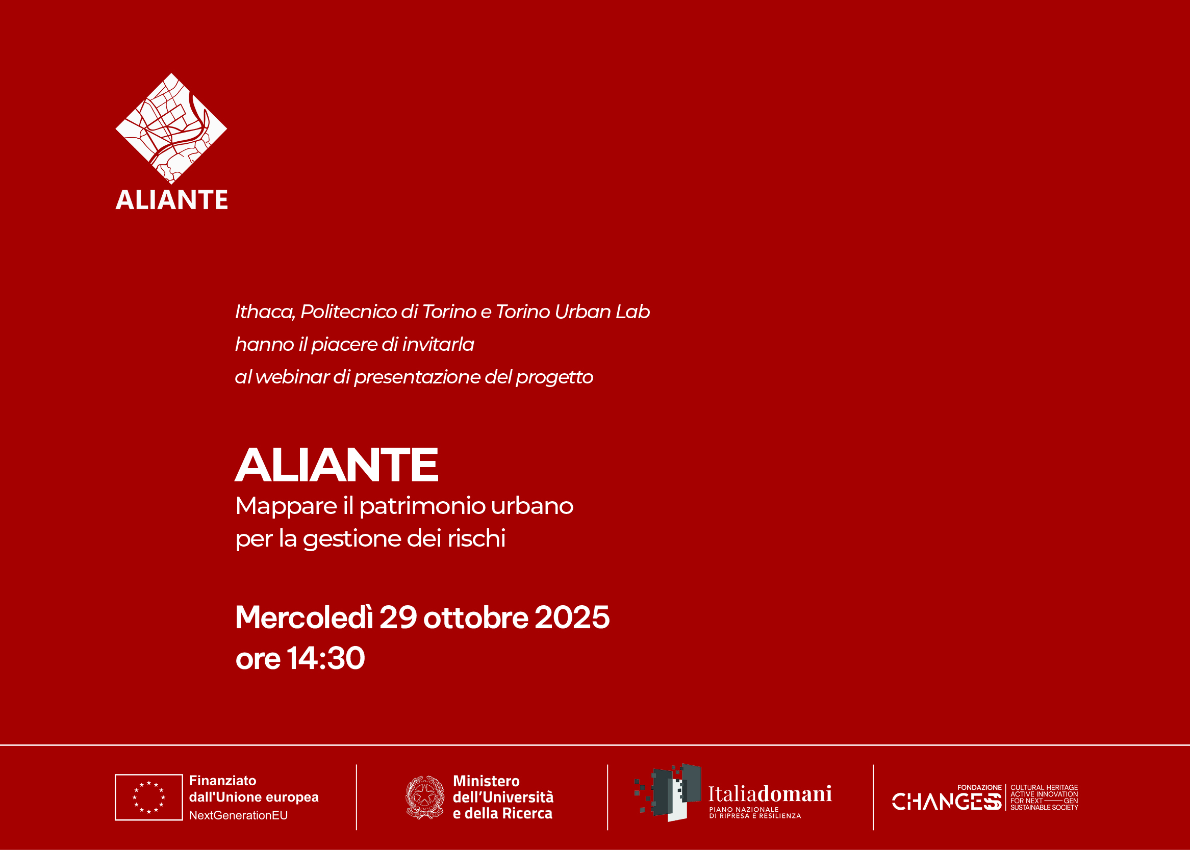 Il webinar sarà l’occasione per scoprire la piattaforma web del Progetto di ricerca ALIANTE (AtLante DIgitale AvaNzato delle CiTtà ItalianE), sviluppata nell’ambito del Progetto di Partenariato Esteso PNRR "CHANGES: Cultural Heritage Innovation for Next-Gen Sustainable Society", spoke 7 "Protection and Conservation of Cultural Heritage against Climate Changes, Natural and Anthropic Risks”.