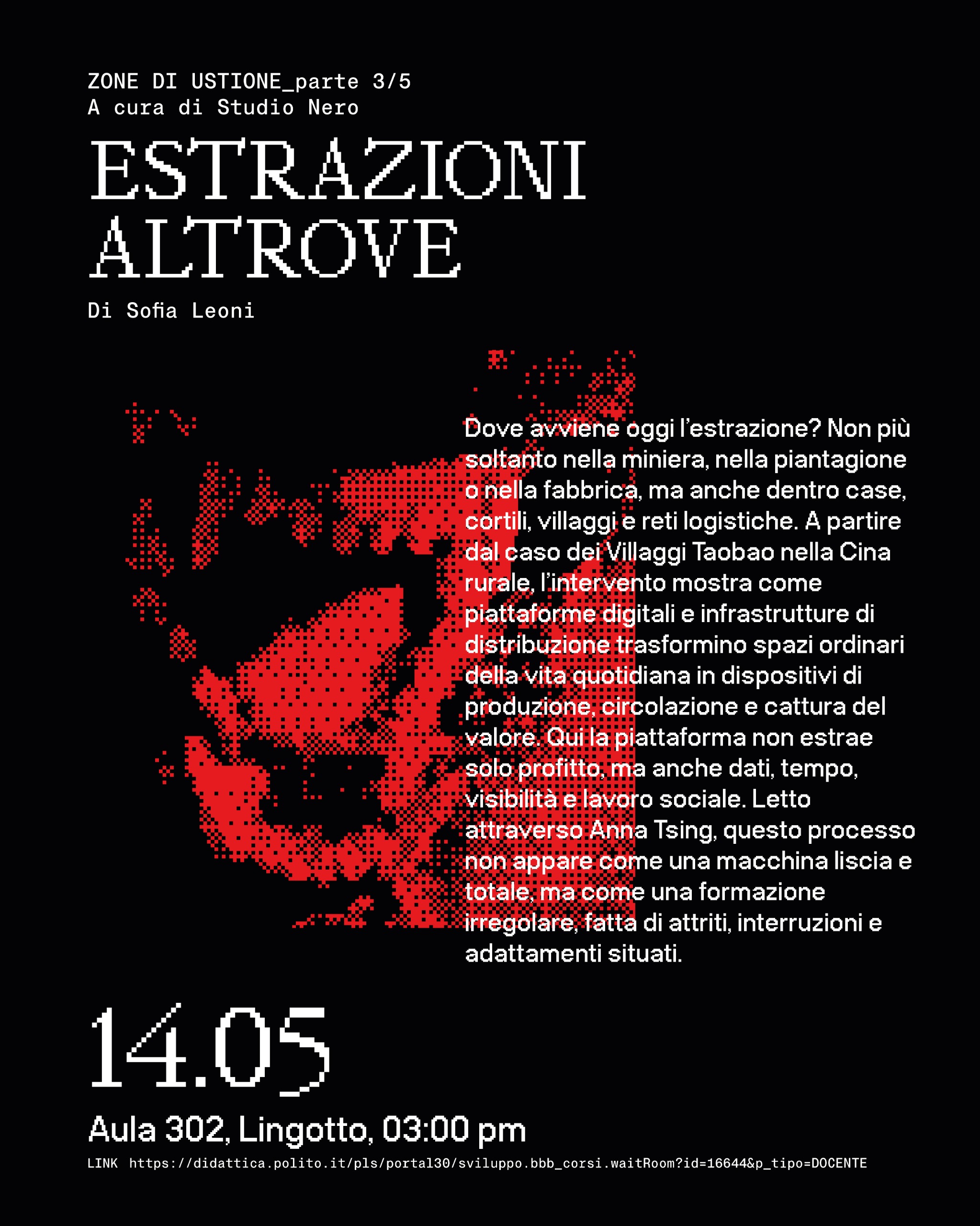 Dove avviene oggi l'estrazione? Non più soltanto nella miniera, nella piantagione o nella fabbrica, ma anche dentro case, cortili, villaggi e reti logistiche. A partire dal caso dei Villaggi Taobao nella Cina rurale, l'intervento mostra come piattaforme digitali e infrastrutture di distribuzione trasformino spazi ordinari della vita quotidiana in dispositivi di produzione, circolazione e cattura del valore. Qui la piattaforma non estrae solo profitto ma anche dati, tempo, visibilità e lavoro sociale. Letto attraverso Anna Tsing, questo processo non appare come una macchina liscia e totale ma come una formazione irregolare, fatta di attriti, interruzioni e adattamenti situati.